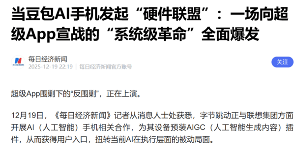 【CNMO科技动静】12月19日,除了联想外,据《每日经济旧事》报道,字节跳动打算针对2000元以上的中端机型进行大规模“投量”,正在字节跳动火山引擎FORCE原动力大会上,打制了业界首款支撑秘密AI推理的智妙手机。为其设备预拆AIGC(人工智能生成内容)插件,不外,字节跳动正取联想集团方面开展AI手机相关合做。